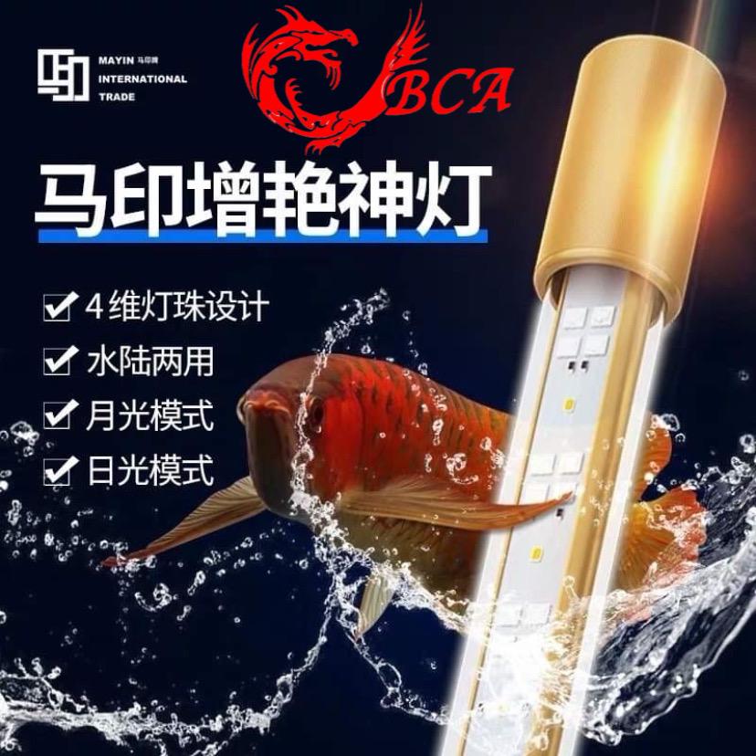 The Mayin Super Colour 3 Plus is an aquarium LED light designed for Arowana fish and other aquatic life, featuring both day and night viewing modes. It boasts a new light bulb and adaptor design, increased brightness up to 108%, and avoids color differences. The light is waterproof and includes adaptors for various power outlets.